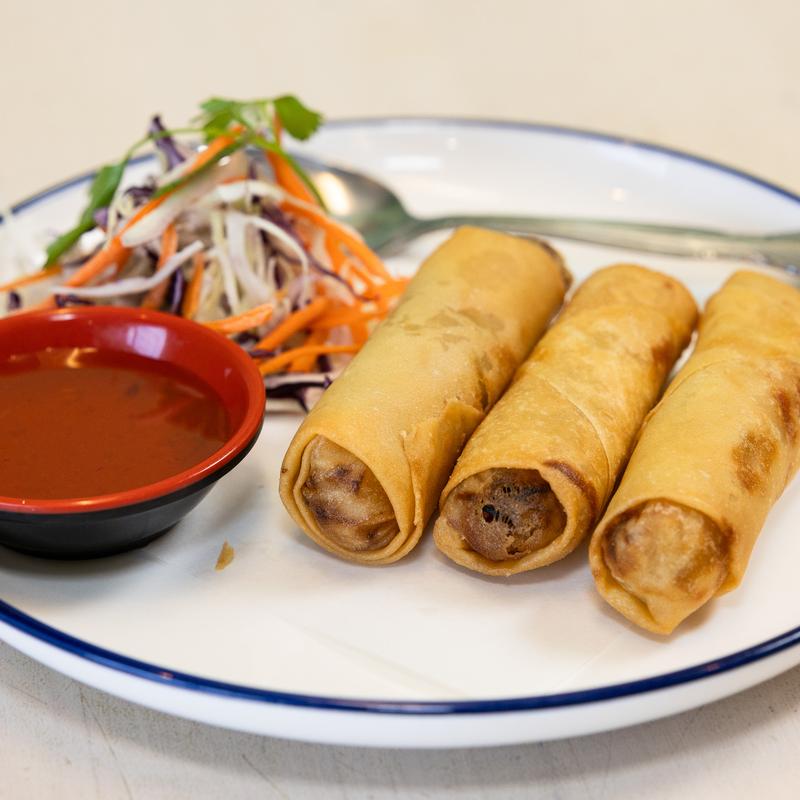 Crispy vegetarian deep fried spring rolls served with Thai sweet and sour sauce