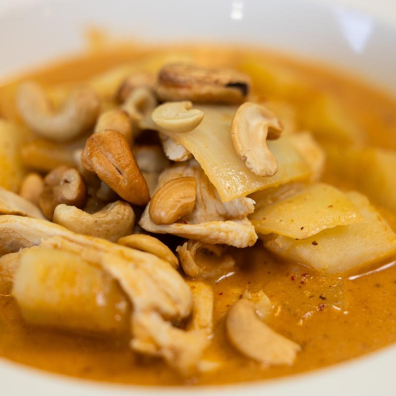 Sweet curry with peanut flavor cooked in coconut milk, potatoes, onion, pineapple and topped with cashew nuts