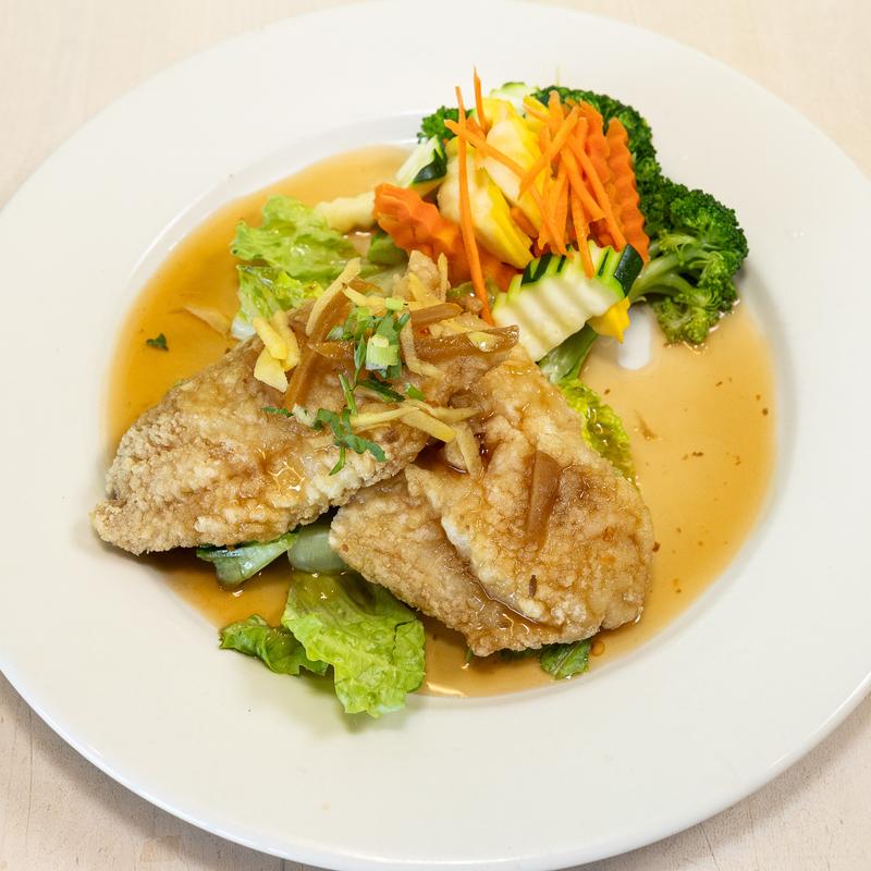 Lightly battered deep fried catfish with ginger sauce served with steamed veggies