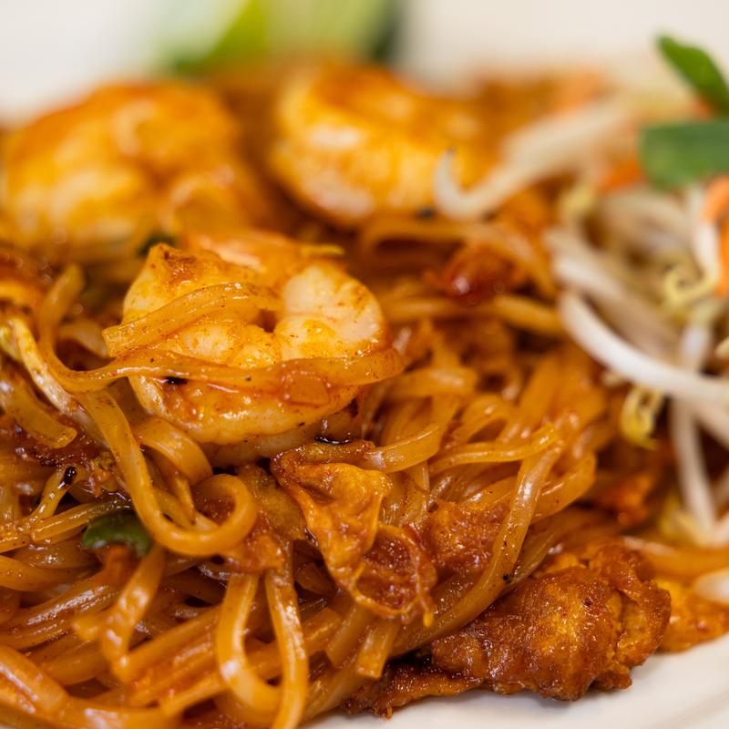 Thin rice noodles stir fried with egg, bean sprouts and green onions, in sweet and tangy sauce then garnished with bean sprouts, peanuts and lime