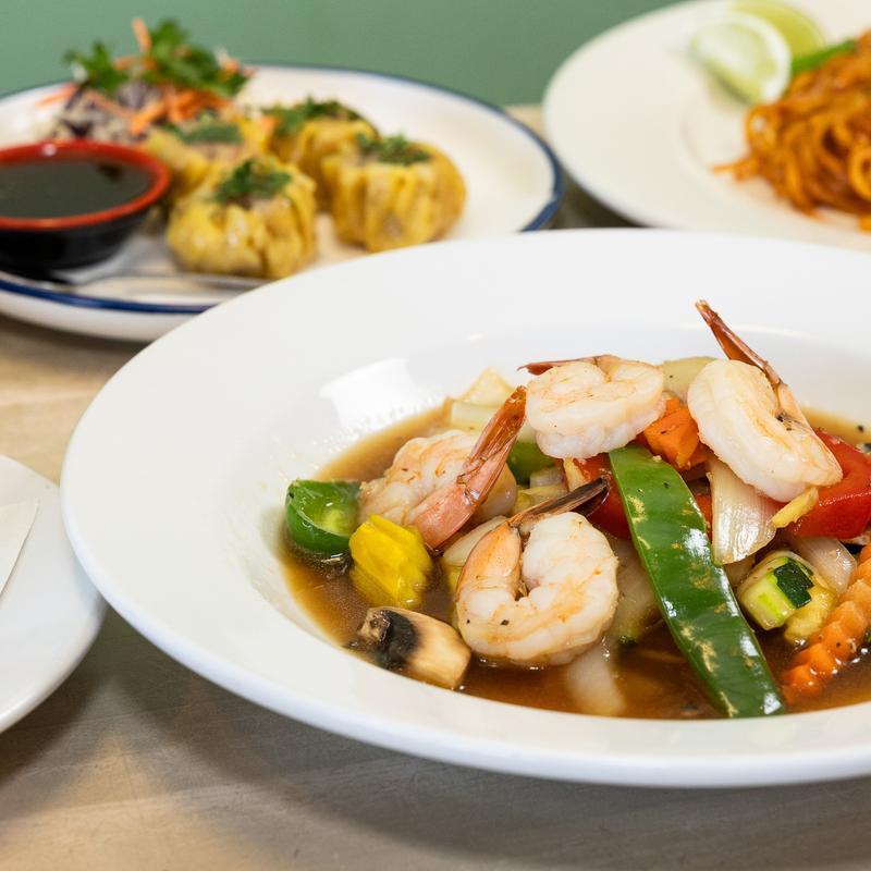 Shrimp stir fried in roasted chili sauce with asparagus, onions, bell peppers and carrots