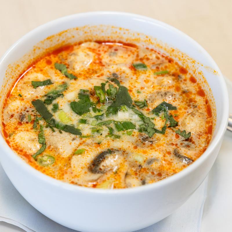 (Spicy) Spicy chicken soup cooked in Thai herbs, lime juice, lemongrass, galangai, spices, mushrooms, cilantro and onion