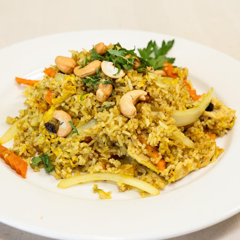 Jasmine rice stir fried with curry powder, egg, raisins, pineapple, cashew nuts and green onion