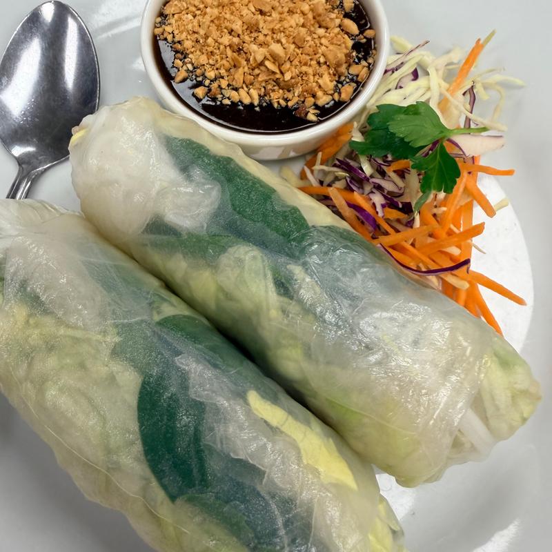 Combination of green leaves, basil, carrots, rice noodles and bean sprouts wrapped in rice paper served with homemade dipping sauce