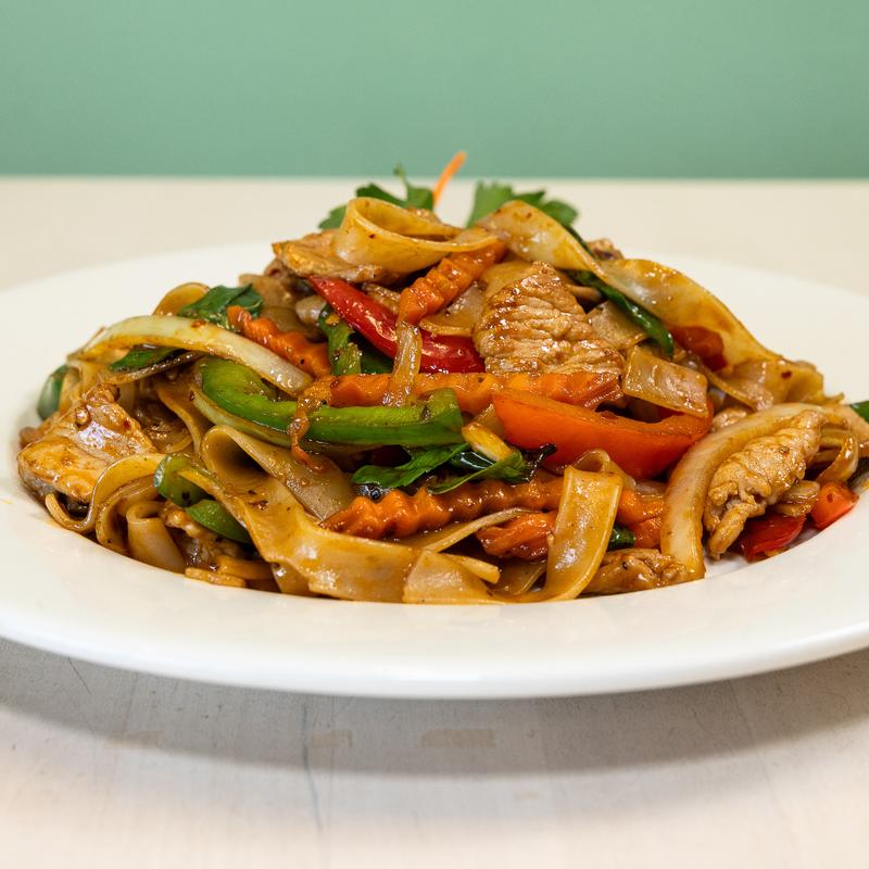 (Spicy noodle) Wide rice noodles, chili peppers, garlic, bell peppers, carrots, onions, and fresh basil