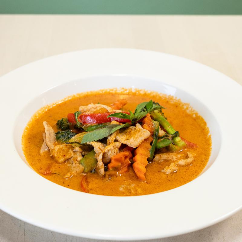 Spicy red curry cooked in coconut milk, zucchini, bamboo shoots, bell peppers, carrots and basil leaves