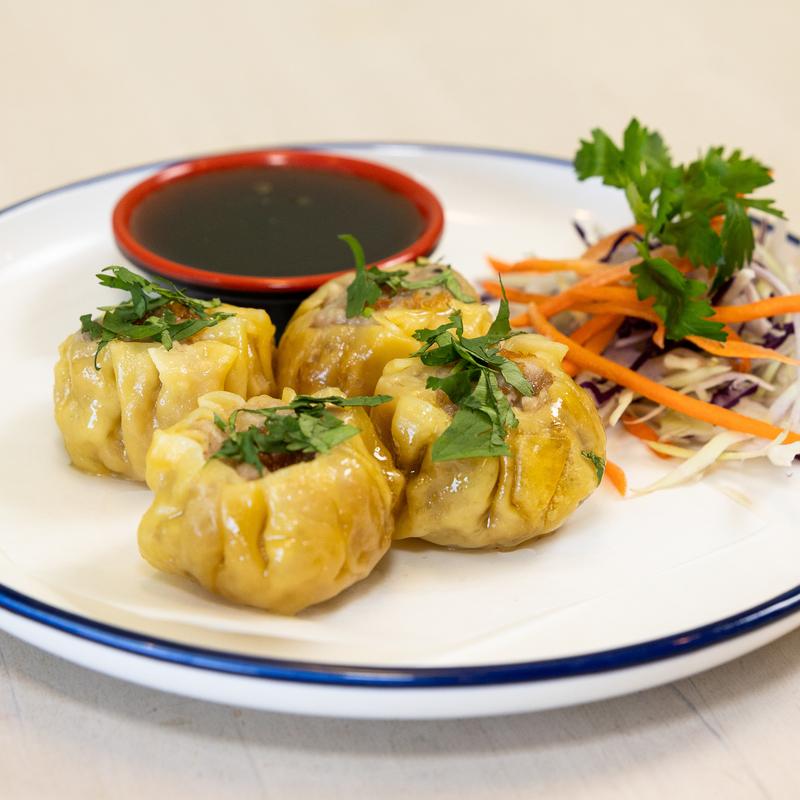 (Kanom Jeeb) Thai-style dumplings stuffed with minced pork, chicken, shrimp, onions and topped with toasted garlic and cilantro