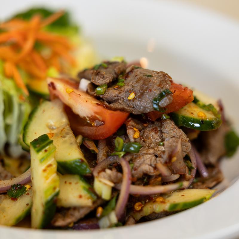 Slice of grilled steak mixed with lime juice, onions, cucumbers, tomatoes, chili peppers, cilantro in house special sauce and lettuce